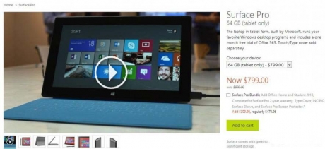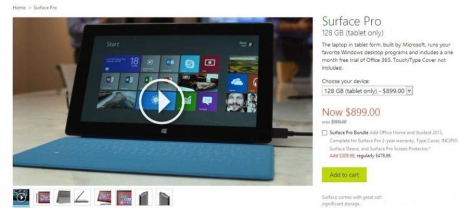 В момента Surface Pro със 128 GB може да бъде закупен в САЩ за 899 $, а моделът с 64 GB памет - за 799 $. Освен това, поевтиня и комплектът Surface Pro Bundle (включва Microsoft Office Home и Student 2013, двугодишна гаранция на таблета, калъфът-Type Cover и протектора на дисплея). Преди това той струваше $ 479, а вече се предлага за 310.